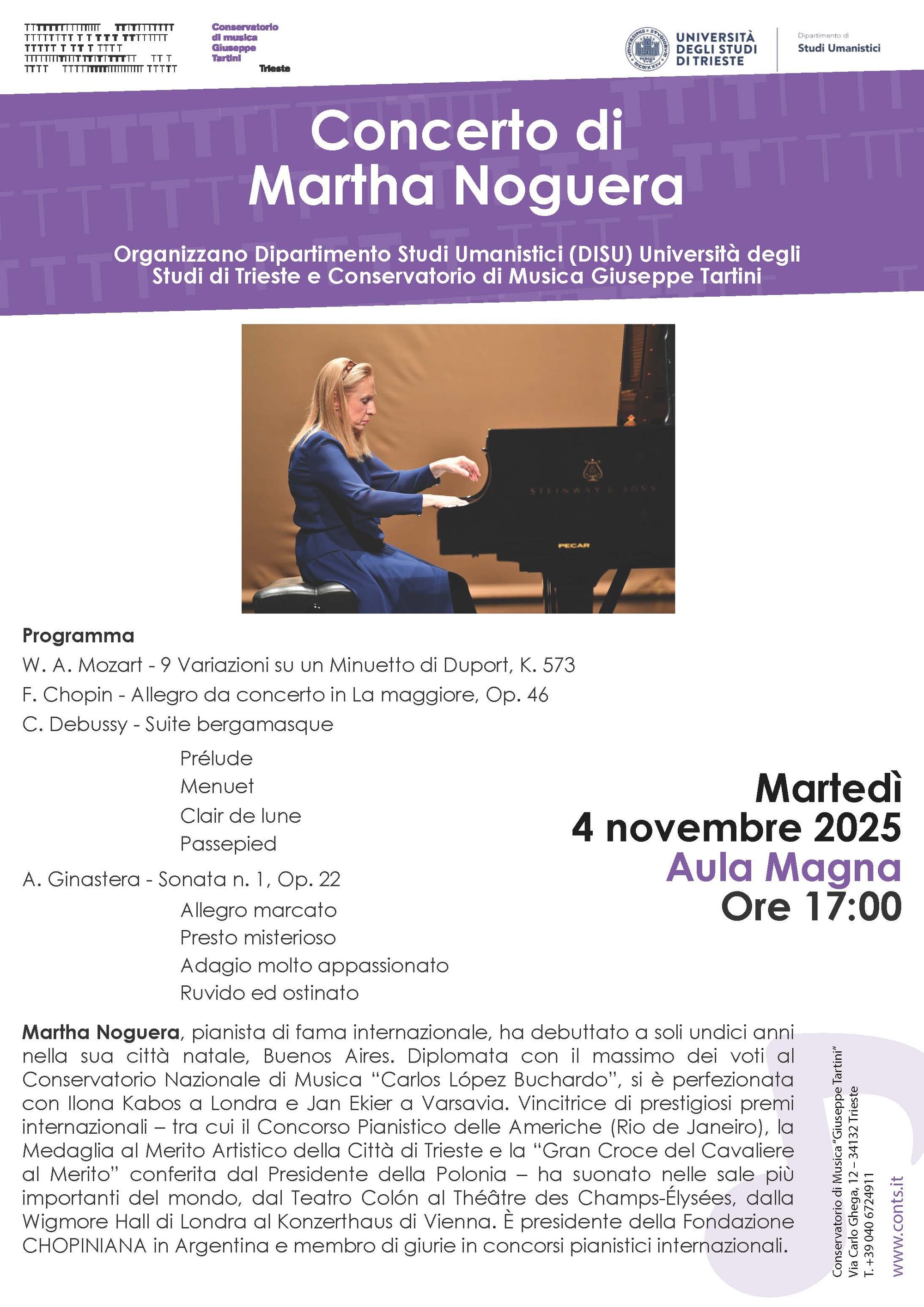 Martha Noguera, pianista di fama internazionale, ha debuttato a soli undici anni nella sua città natale, Buenos Aires. Diplomata con il massimo dei voti al Conservatorio Nazionale di Musica “Carlos López Buchardo”, si è perfezionata con Ilona Kabos a Londra e Jan Ekier a Varsavia. Vincitrice di prestigiosi premi internazionali – tra cui il Concorso Pianistico delle Americhe (Rio de Janeiro), la Medaglia al Merito Artistico della Città di Trieste e la “Gran Croce del Cavaliere al Merito” conferita dal Presidente della Polonia – ha suonato nelle sale più importanti del mondo, dal Teatro Colón al Théâtre des Champs-Élysées, dalla Wigmore Hall di Londra al Konzerthaus di Vienna. È presidente della Fondazione CHOPINIANA in Argentina e membro di giurie in concorsi pianistici internazionali.