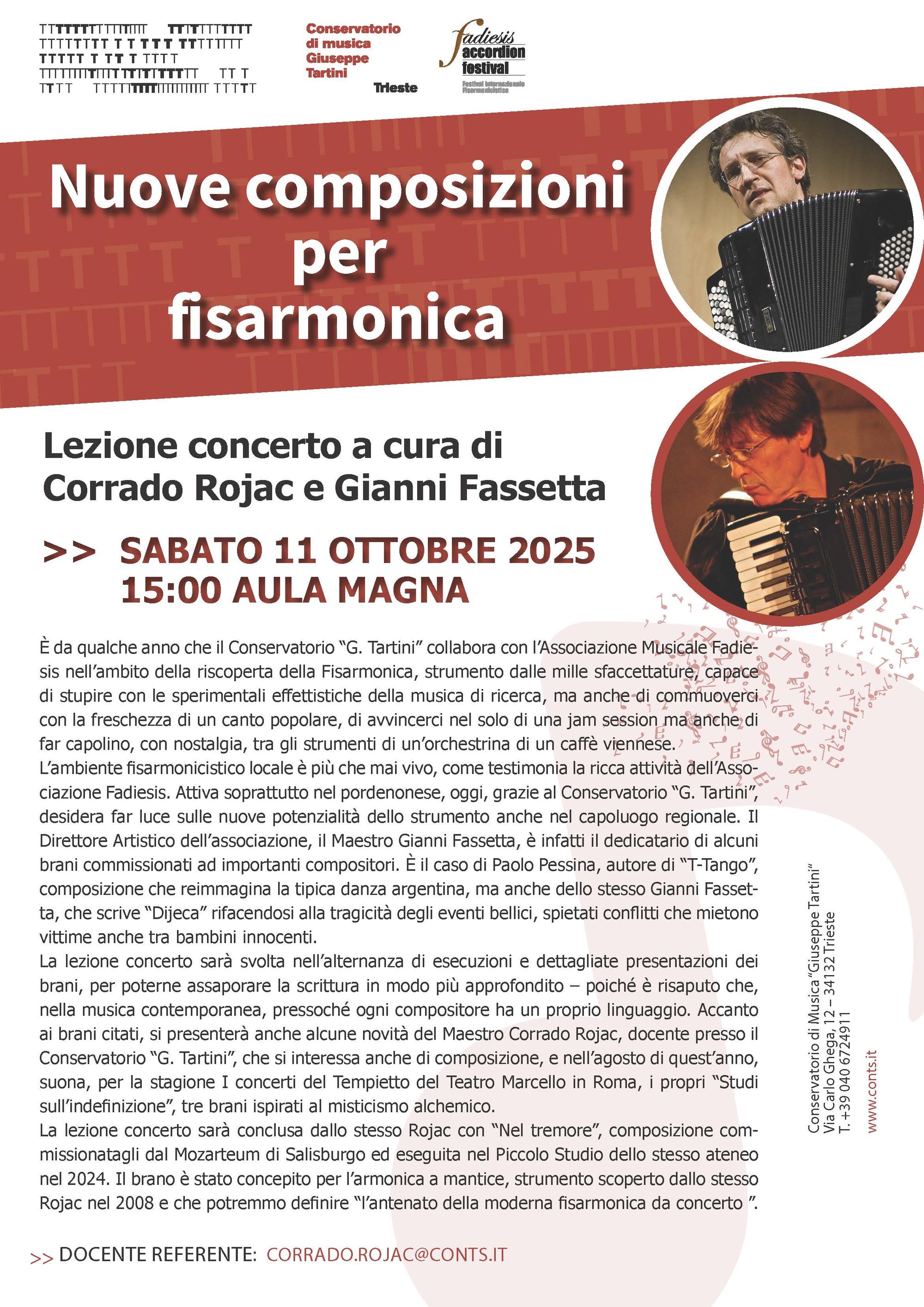 È da qualche anno che il Conservatorio “G. Tartini” collabora con l’Associazione Musicale Fadiesis nell’ambito della riscoperta della Fisarmonica, strumento dalle mille sfaccettature, capace di stupire con le sperimentali effettistiche della musica di ricerca, ma anche di commuoverci con la freschezza di un canto popolare, di avvincerci nel solo di una jam session ma anche di far capolino, con nostalgia, tra gli strumenti di un’orchestrina di un caffè viennese.