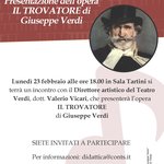 Lunedì 23 febbraio alle ore 18.00 in Sala Tartini si terrà un incontro con il Direttore artistico del Teatro Verdi, dott. Valerio Vicari, che presenterà l’opera IL TROVATORE di Giuseppe Verdi.