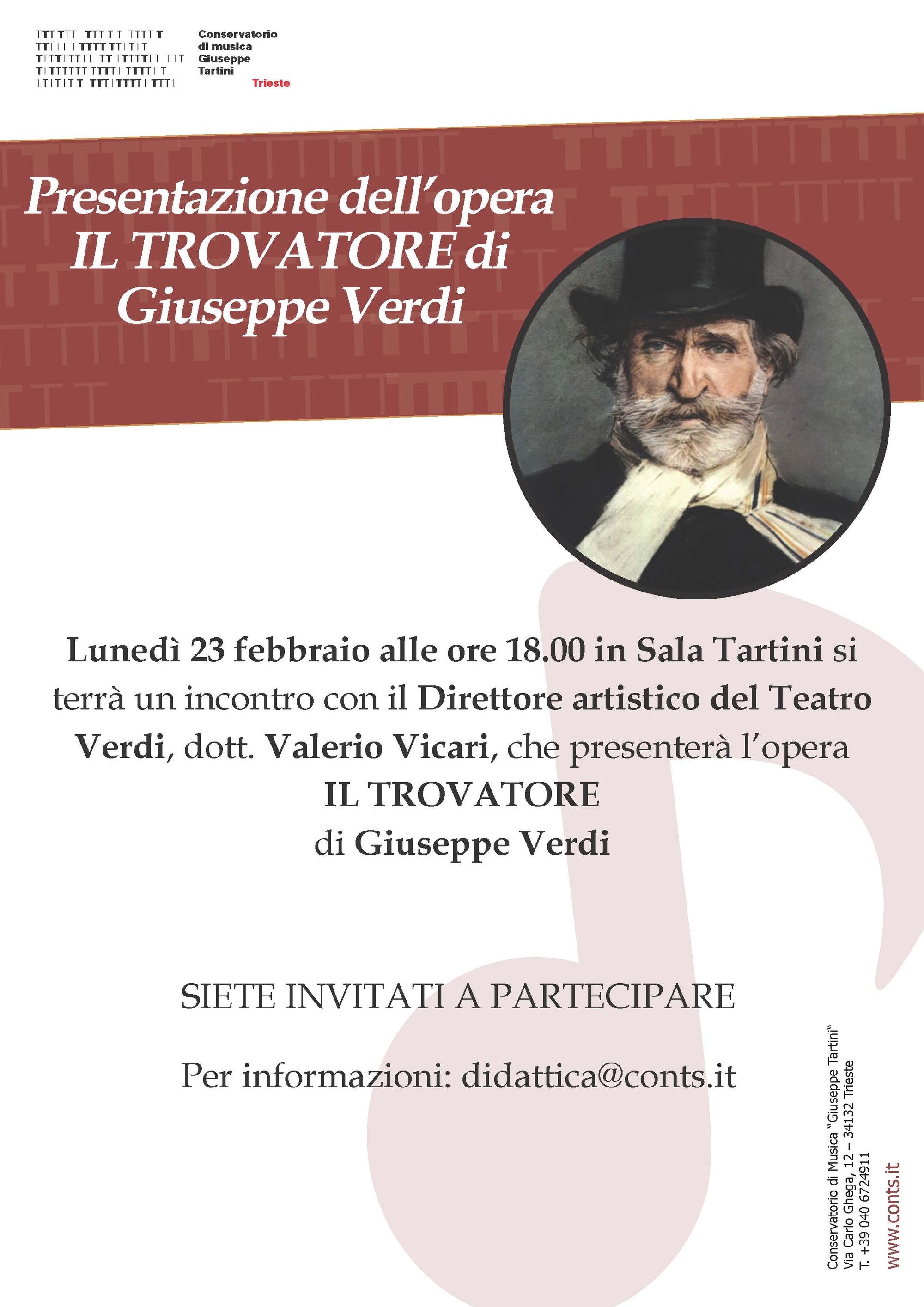 Lunedì 23 febbraio alle ore 18.00 in Sala Tartini si terrà un incontro con il Direttore artistico del Teatro Verdi, dott. Valerio Vicari, che presenterà l’opera IL TROVATORE di Giuseppe Verdi.