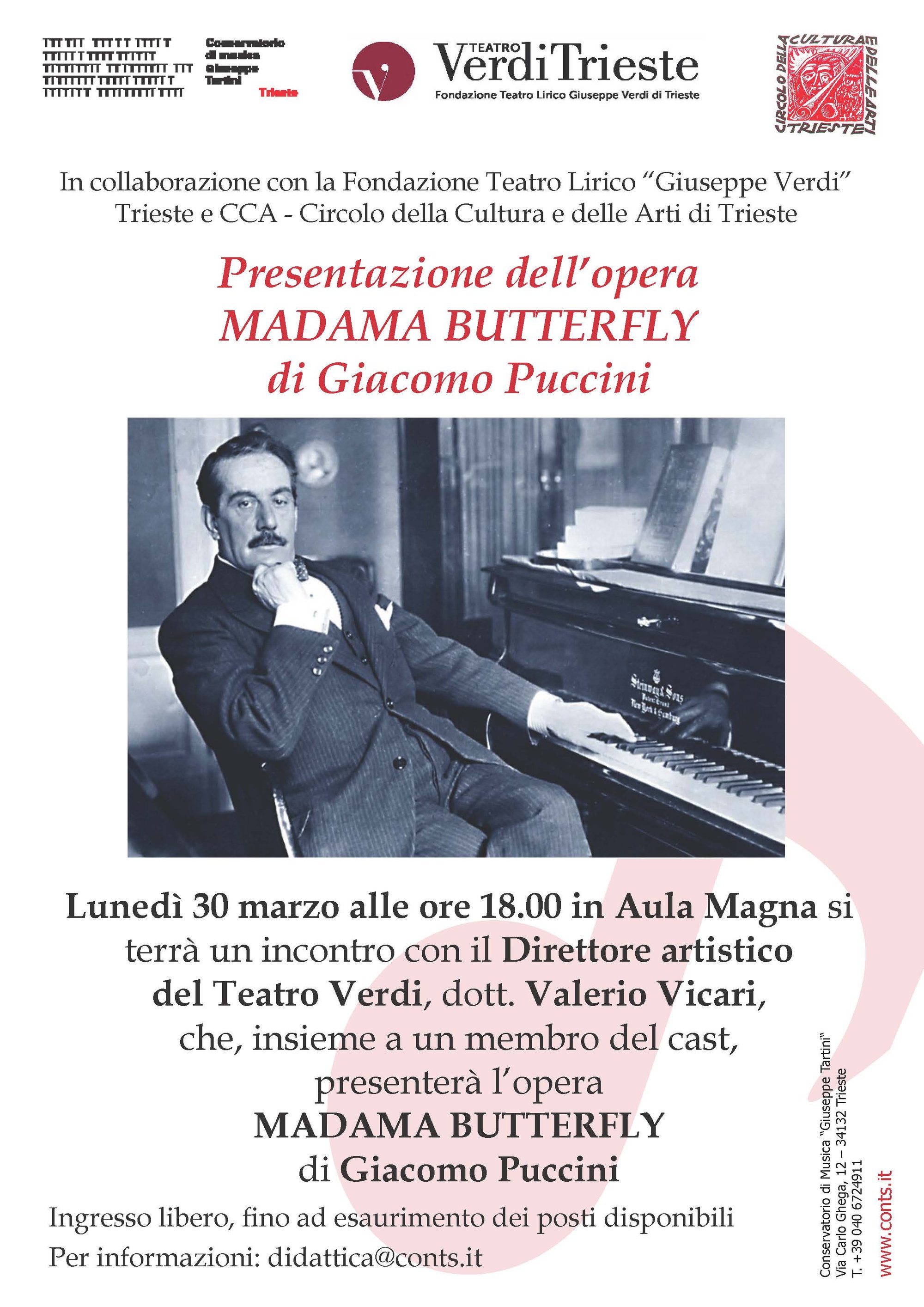 Lunedì 30 marzo alle ore 18.00 in Aula Magna si terrà un incontro con il Direttore artistico del Teatro Verdi, dott. Valerio Vicari, che, insieme a un membro del cast, presenterà l’opera MADAMA BUTTERFLY di Giacomo Puccini