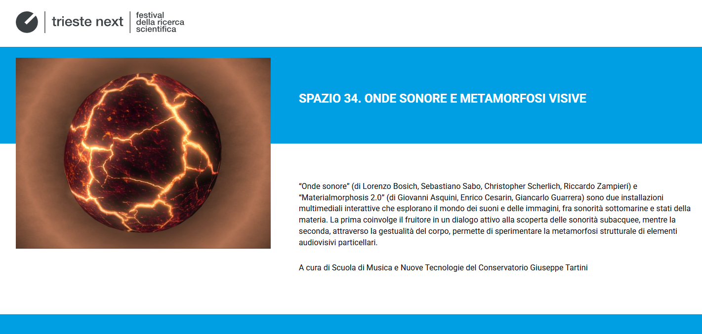 “Onde sonore” (di Lorenzo Bosich, Sebastiano Sabo, Christopher Scherlich, Riccardo Zampieri) e “Materialmorphosis 2.0” (di Giovanni Asquini, Enrico Cesarin, Giancarlo Guarrera) sono due installazioni multimediali interattive che esplorano il mondo dei suoni e delle immagini, fra sonorità sottomarine e stati della materia. La prima coinvolge il fruitore in un dialogo attivo alla scoperta delle sonorità subacquee, mentre la seconda, attraverso la gestualità del corpo, permette di sperimentare la metamorfosi strutturale di elementi audiovisivi particellari.