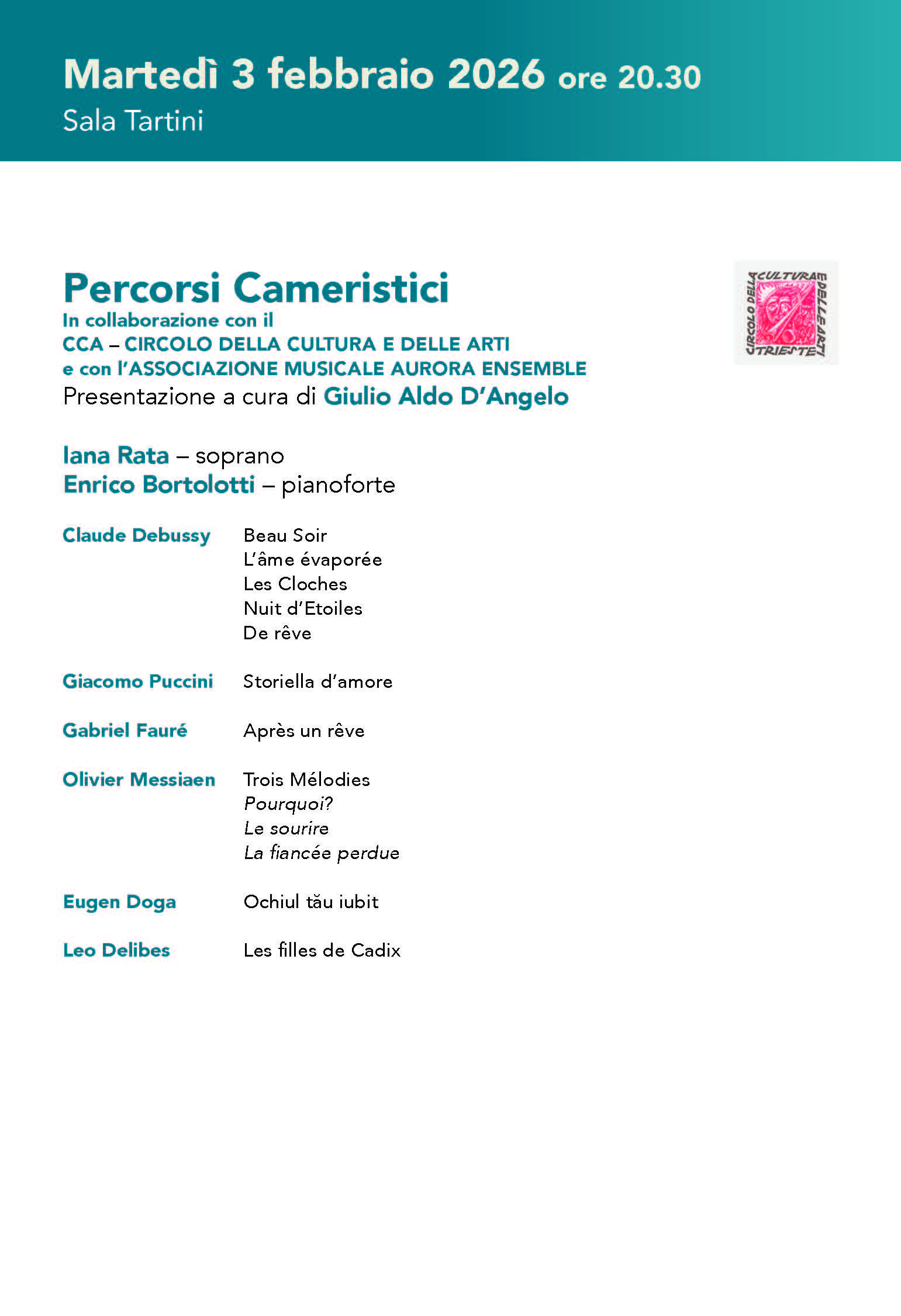 In collaborazione con il CCA – CIRCOLO DELLA CULTURA E DELLE ARTI e con l’ASSOCIAZIONE MUSICALE AURORA ENSEMBLE