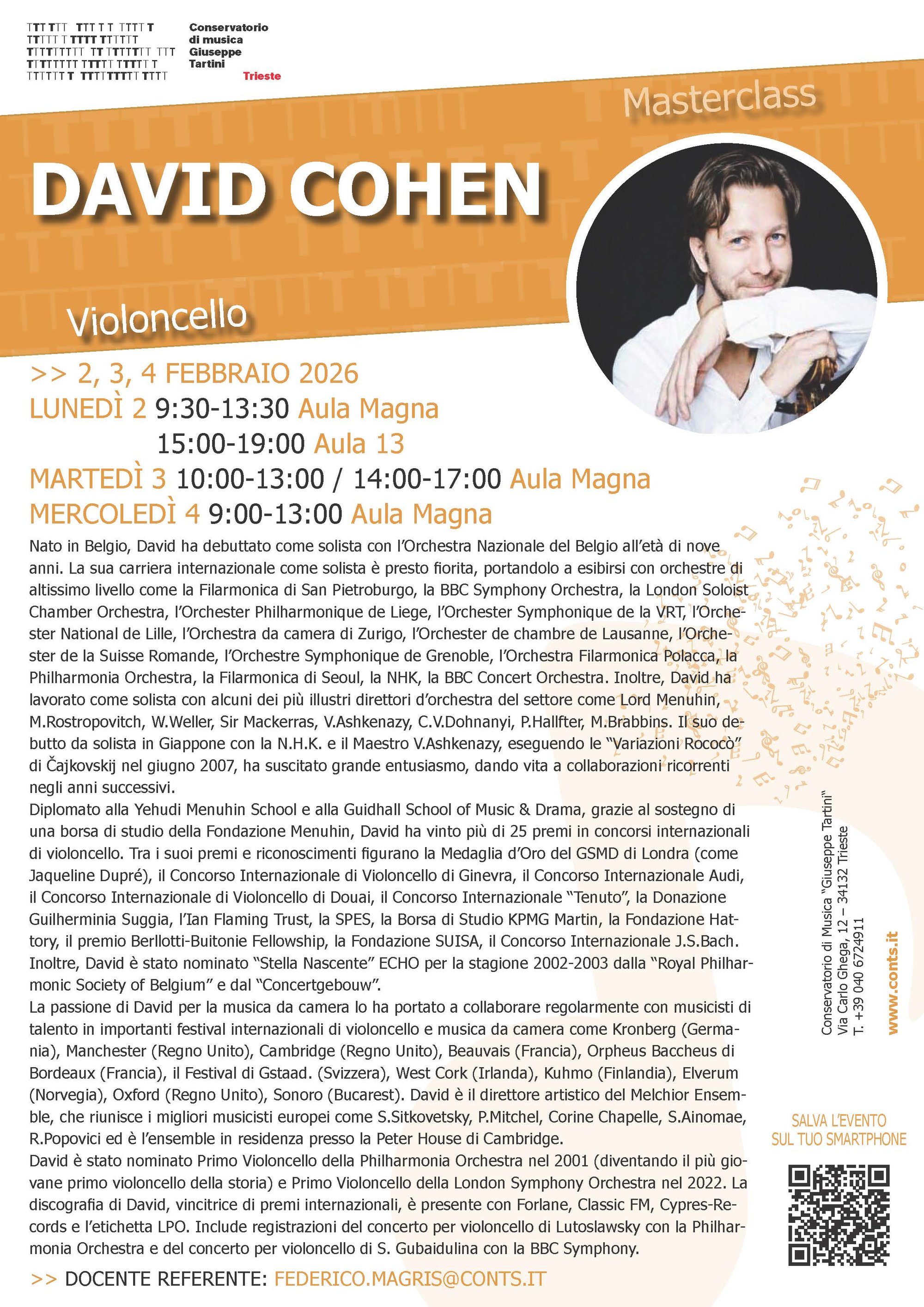 Nato in Belgio, David ha debuttato come solista con l’Orchestra Nazionale del Belgio all’età di nove anni. La sua carriera internazionale come solista è presto fiorita, portandolo a esibirsi con orchestre di altissimo livello come la Filarmonica di San Pietroburgo, la BBC Symphony Orchestra, la London Soloist Chamber Orchestra, l’Orchester Philharmonique de Liege, l’Orchester Symphonique de la VRT, l’Orchester National de Lille, l’Orchestra da camera di Zurigo, l’Orchester de chambre de Lausanne, l’Orchester de la Suisse Romande, l’Orchestre Symphonique de Grenoble, l’Orchestra Filarmonica Polacca, la Philharmonia Orchestra, la Filarmonica di Seoul, la NHK, la BBC Concert Orchestra. Inoltre, David ha lavorato come solista con alcuni dei più illustri direttori d’orchestra del settore come Lord Menuhin, M.Rostropovitch, W.Weller, Sir Mackerras, V.Ashkenazy, C.V.Dohnanyi, P.Hallfter, M.Brabbins. Il suo debutto da solista in Giappone con la N.H.K. e il Maestro V.Ashkenazy, eseguendo le “Variazioni Rococò” di Čajkovskij nel giugno 2007, ha suscitato grande entusiasmo, dando vita a collaborazioni ricorrenti negli anni successivi.