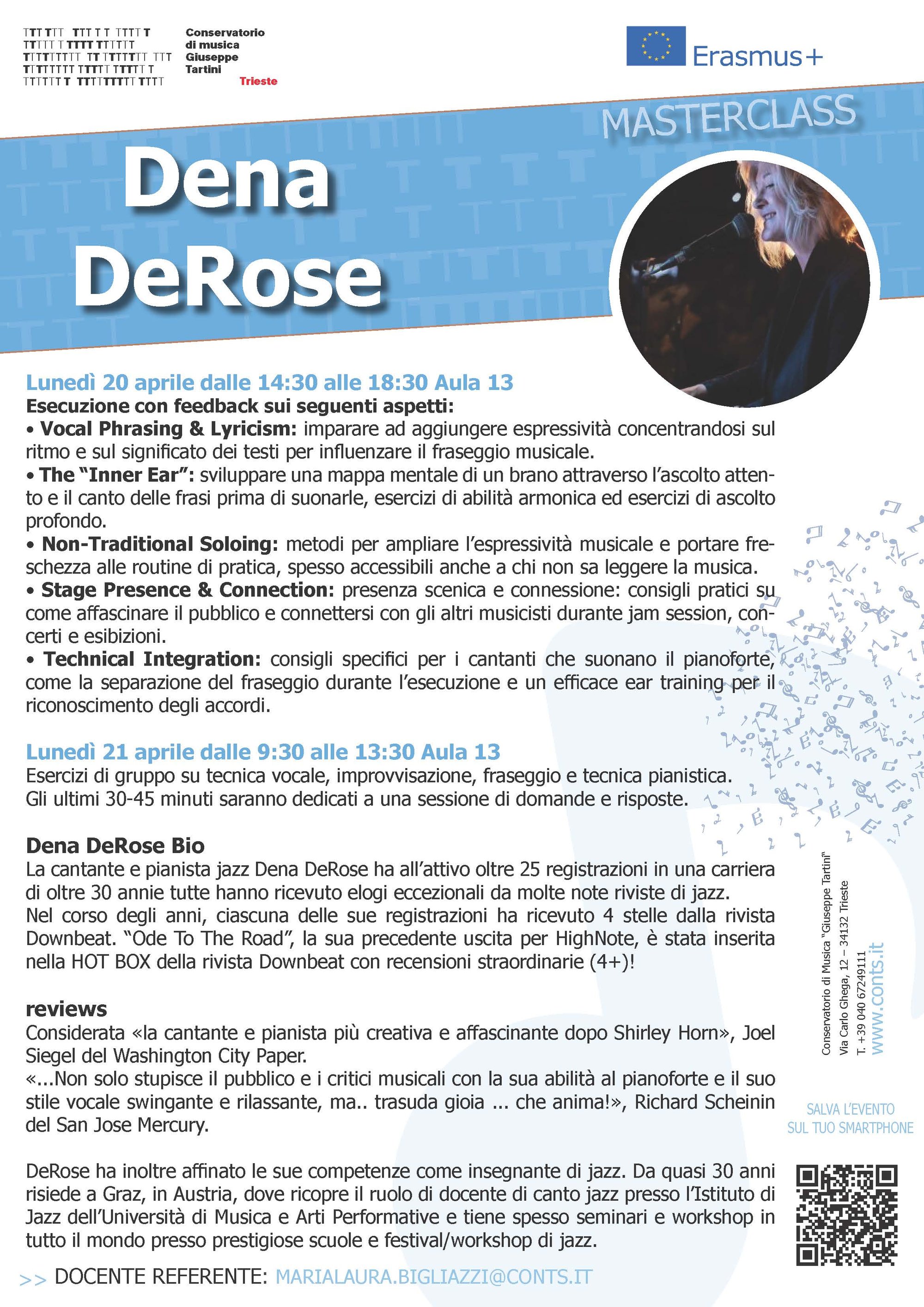Esercizi di gruppo su tecnica vocale, improvvisazione, fraseggio e tecnica pianistica. Gli ultimi 30-45 minuti saranno dedicati a una sessione di domande e risposte.