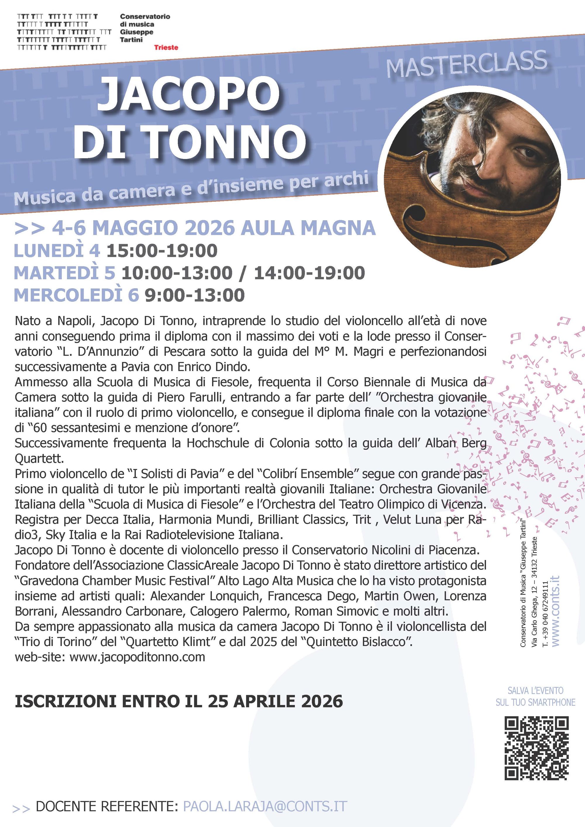 Jacopo Di Tonno è docente di violoncello presso il Conservatorio Nicolini di Piacenza. Fondatore dell’Associazione ClassicAreale Jacopo Di Tonno è stato direttore artistico del “Gravedona Chamber Music Festival” Alto Lago Alta Musica che lo ha visto protagonista insieme ad artisti quali: Alexander Lonquich, Francesca Dego, Martin Owen, Lorenza Borrani, Alessandro Carbonare, Calogero Palermo, Roman Simovic e molti altri.