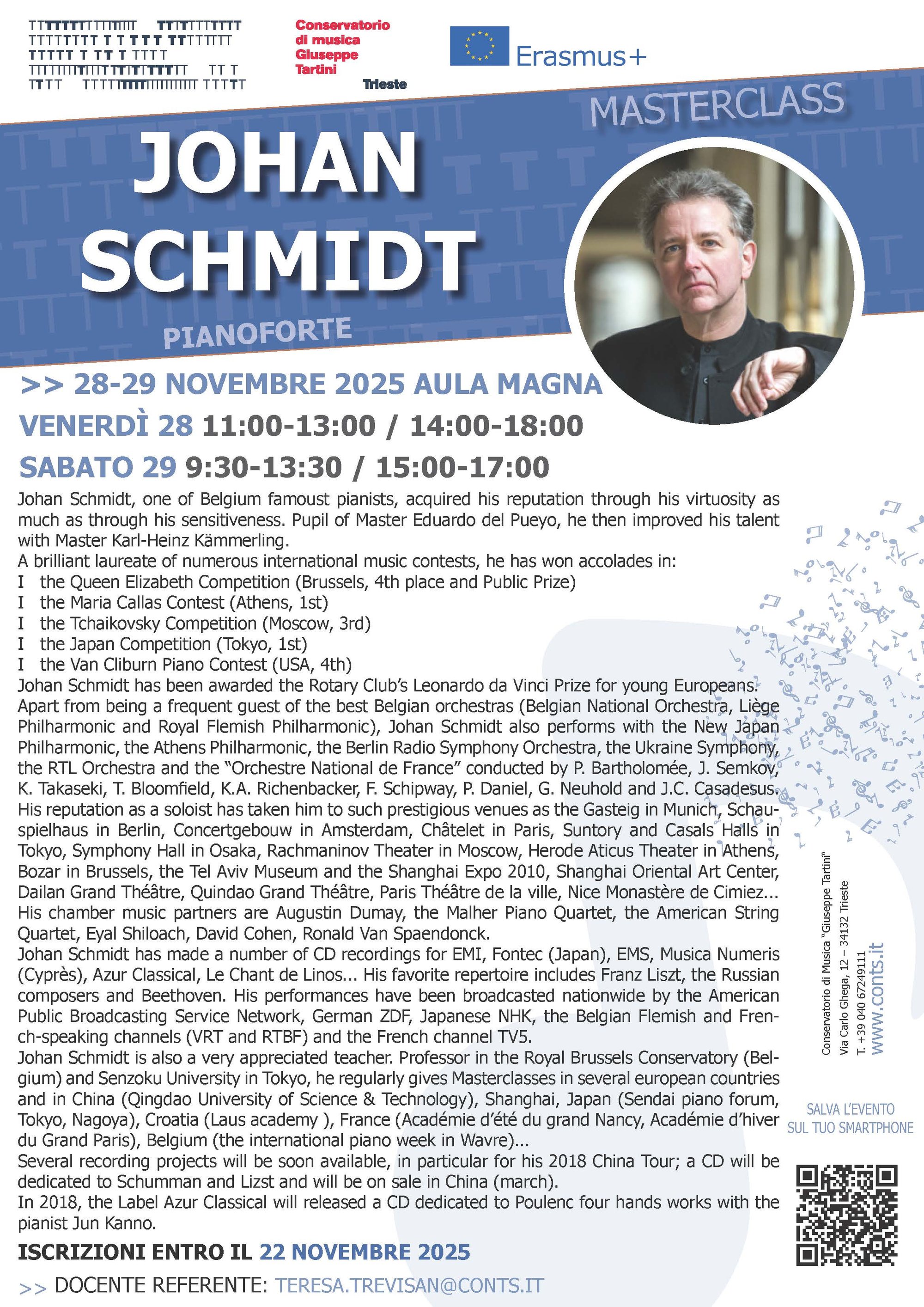 Johan Schmidt is also a very appreciated teacher. Professor in the Royal Brussels Conservatory (Belgium) and Senzoku University in Tokyo, he regularly gives Masterclasses in several european countries and in China (Qingdao University of Science & Technology), Shanghai, Japan (Sendai piano forum, Tokyo, Nagoya), Croatia (Laus academy ), France (Académie d’été du grand Nancy, Académie d’hiver du Grand Paris), Belgium (the international piano week in Wavre)...