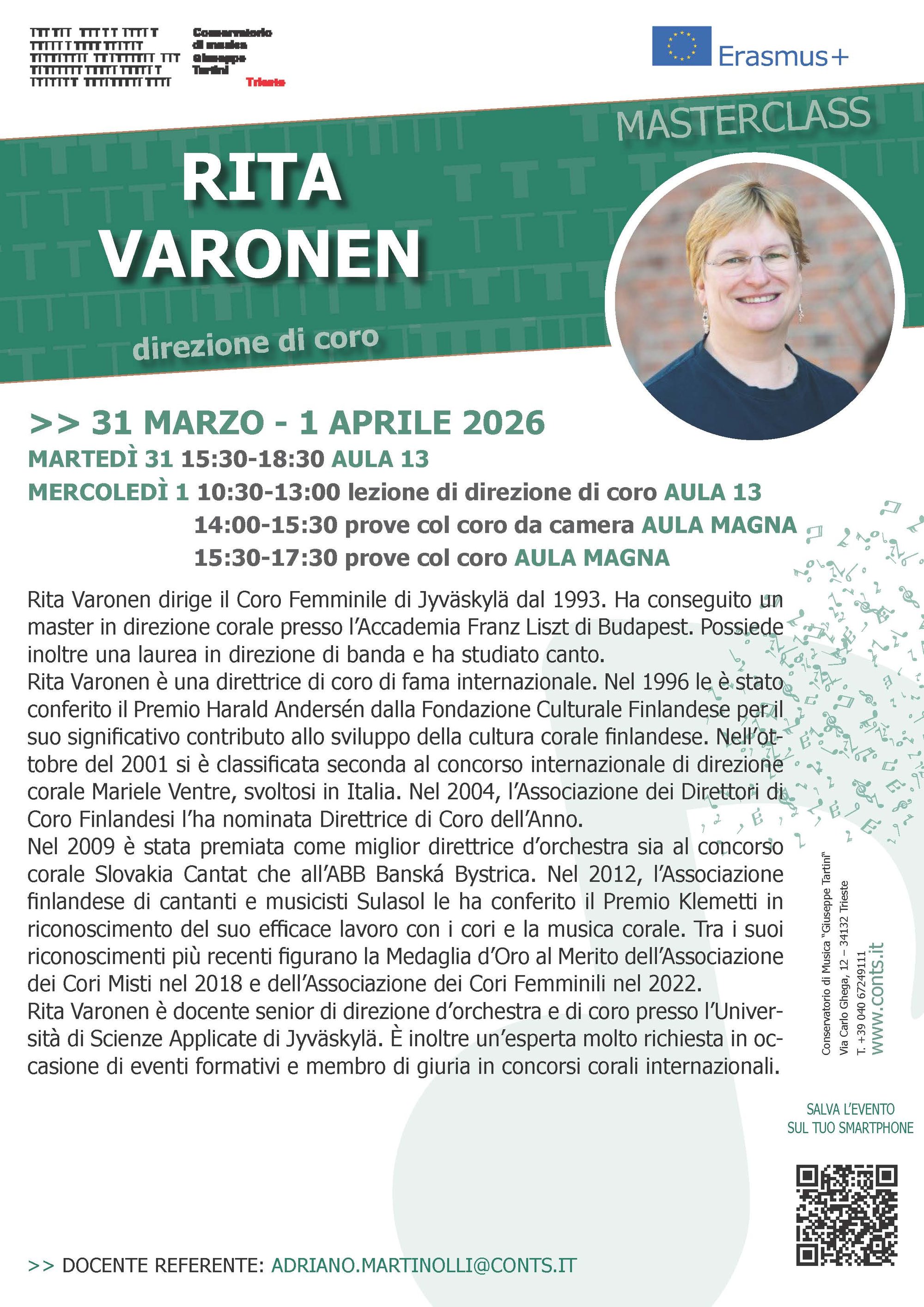 Rita Varonen è una direttrice di coro di fama internazionale. Nel 1996 le è stato conferito il Premio Harald Andersén dalla Fondazione Culturale Finlandese per il suo significativo contributo allo sviluppo della cultura corale finlandese. Nell’ottobre del 2001 si è classificata seconda al concorso internazionale di direzione corale Mariele Ventre, svoltosi in Italia. Nel 2004, l’Associazione dei Direttori di Coro Finlandesi l’ha nominata Direttrice di Coro dell’Anno.