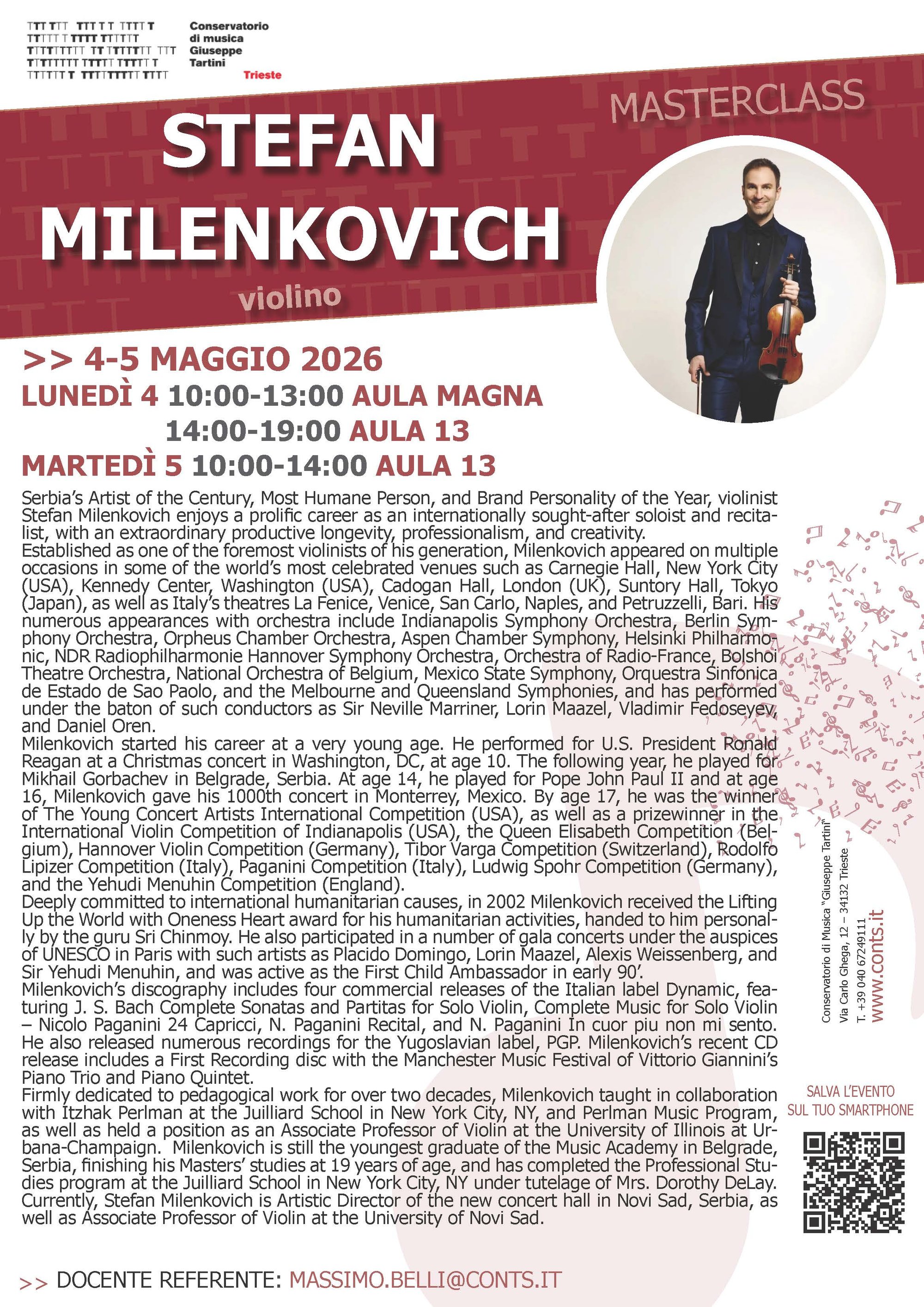 Firmly dedicated to pedagogical work for over two decades, Milenkovich taught in collaboration with Itzhak Perlman at the Juilliard School in New York City, NY, and Perlman Music Program, as well as held a position as an Associate Professor of Violin at the University of Illinois at Urbana-Champaign. Milenkovich is still the youngest graduate of the Music Academy in Belgrade, Serbia, finishing his Masters’ studies at 19 years of age, and has completed the Professional Studies program at the Juilliard School in New York City, NY under tutelage of Mrs. Dorothy DeLay. Currently, Stefan Milenkovich is Artistic Director of the new concert hall in Novi Sad, Serbia, as well as Associate Professor of Violin at the University of Novi Sad.