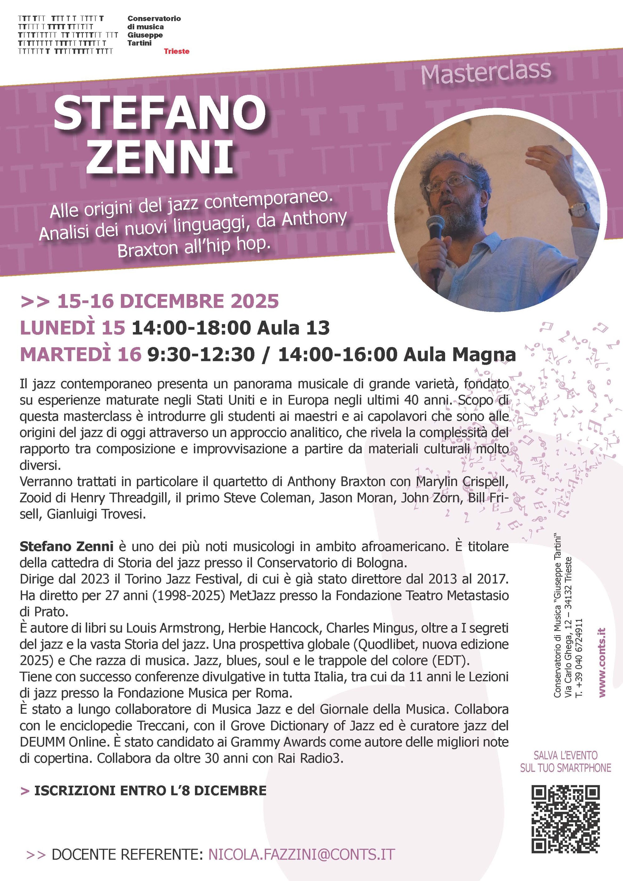 Il jazz contemporaneo presenta un panorama musicale di grande varietà, fondato su esperienze maturate negli Stati Uniti e in Europa negli ultimi 40 anni. Scopo di questa masterclass è introdurre gli studenti ai maestri e ai capolavori che sono alle origini del jazz di oggi attraverso un approccio analitico, che rivela la complessità del rapporto tra composizione e improvvisazione a partire da materiali culturali molto diversi.